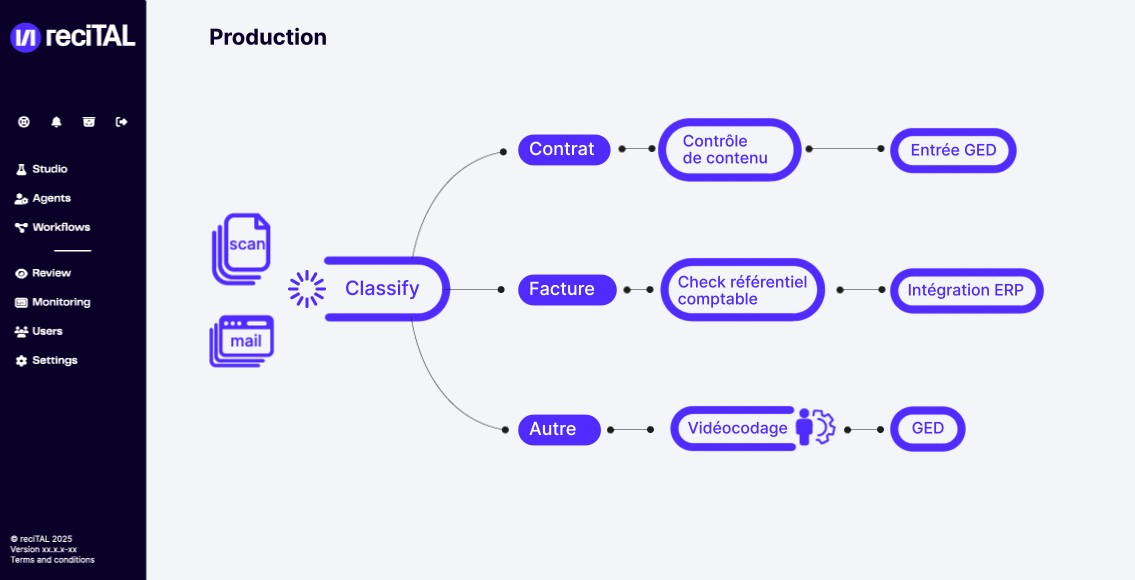 La plateforme de production reciTAL propose un moteur de workflow puissant pour animer les agents, appeler des services, exécuter des règles de validation métier ou exécuter un bloc de code. Le module de vidéocodage vous permet de créer des écrans de correction sur mesure et de gérer des files de traitement. Enfin, le monitoring vous donne une vision claire et précise de vos flux, consommation et corrections en temps réel.